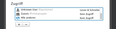 Die gewünschte Einstellung lässt sich neben dem Benutzer- bzw. Gruppennamen per Click und Auswahl einstellen. Durch den „+“-Button und den „-„-Button können Benutzer und Gruppen hinzugefügt und entfernt werden.