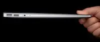3. Schritt: Das Macbook Air hat die Ausmasse 11.8″ breit und 7.56″ hoch mit einer Dicke zwischen .68″ und .11″. An der Vorderseite ist der Infrarot Snsor und die Standby LED angebracht. Einen mechanischen Verschluss, der das Macbook im geschlossenen Zustand zusammenhält gibt es nicht mehr. An den Seiten ist der Display-Port und USB-Ports, sowie der Mag-Safe Power-Adadpter Port angebracht.