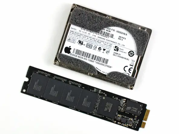4. Schritt: Anstelle einer klassischen Magnet-Festplatte oder einem SSD-Laufwerk hat das MacBook Air eine SSD Chipleiste, die aus sechs Hauptchips besteht und individuell von Apple für das MacBook Air entwickelt wurde. VEs handelt sich um vier Toshiba TH58NVG7D7FBASB 16GB Flash Chips (Gesamtkapazität 64 GB), einen Toshiba T6UG1XBG Solid State Drive Controller und einen Micron Chip OKA17 D9HSJ DDR DRAM cache. Die Modelnummer der SSD Chipleiste lautet THNSNC064GMDJ. Sie ist 2.45 mm dick (10 gr. schwer) und damit erheblich kleiner als die bisher verwendeten 5.12 mm (45 gr.) Laufwerke in früheren MacBook Air Notebooks.