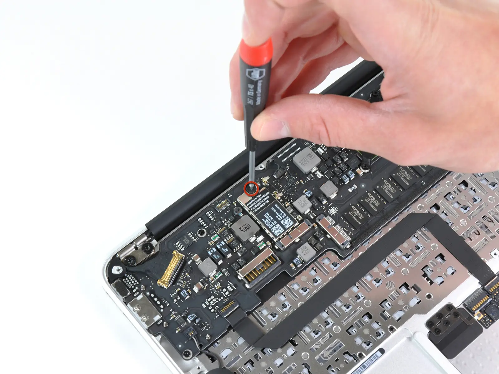 5. Schritt: Die Wireless-Karte (WLAN 802.11n und Bluetooth) ist auf dem Logic-Board mit nur einer Schraube befestigt und ebenfalls erheblich kleiner als die bisher in MacBook Pros verwendeten Karten, wenngleich der Wi-Fi/Bluetooth Chip der gleiche ist. Die Modellnummer lautet BCM943224PCIEBT2.