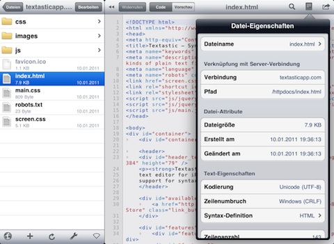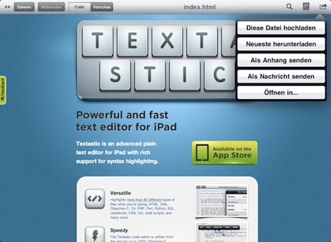 Textastic ist aktuell der HTML-Editor für das Apple iPad und unsere erste Wahl, wenn es einmal darum geht auf dem Sofa oder von unterwegs aus kleinere Änderungen am Code vorzunehmen.
