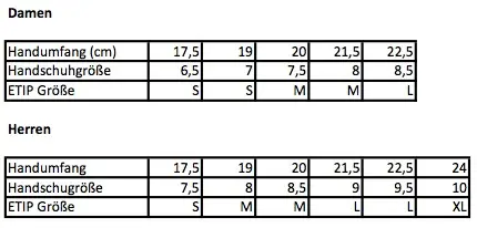 - Für kältere Temperaturen und zum Skifahren, gibt es den Etip Pamir als voll ausgestatteten dicken Winterhandschuh aus Winstopper-Fleece – das neueste Modell mit einem Verkaufspreis von ca. 50 Euro.