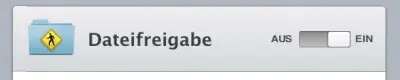 Die Dateifreigabe kann über den Punkt Dienste und den Unterpunkt Dateifreigabe in der linken Menüspalte des server.app Fensters (siehe oben) eingestellt werden. Klickt man darauf erscheint im Hauptfenster ein unübersehbarer Schriftzug „Dateifreigabe“ mit einem großen Schalter dahinter der die Dateifreigabe bzw. das Filesharing aktiviert bzw. abschalten lässt.
