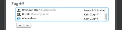 Die gewünschte Einstellung lässt sich neben dem Benutzer- bzw. Gruppennamen per Click und Auswahl einstellen. Durch den „+“-Button und den „-„-Button können Benutzer und Gruppen hinzugefügt und entfernt werden.