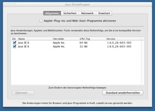 Ist Java-Einstellungen.app einmal gestartet, findet man folgende Übersicht vor sich.