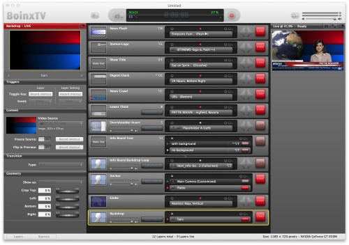 BoinxTV arbeitet vollständig Layer-basiert – wie man es u.a. von Adobe Photoshop kennt. Damit besteht die Möglichkeit verschiedene Grafik-Ebenen einzublenden, auszublenden, übereinander zu schieben usw.